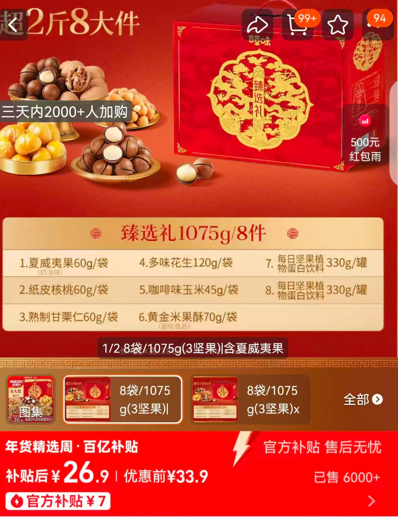 记者搜刮发觉百草味旗舰店看到,有分歧价位的礼盒热卖,正在记者的搜刮中,百草味旗舰店并未有这款产物的链接,记者后台征询了旗舰店客服,客服暗示,已对各平台的店肆进行全面排查,确认店肆发卖产物中未有上述组合产物,具体环境会做进一步查询拜访领会。不外,记者正在百草味旗舰店也搜刮到其他的坚果礼盒套拆,一款“百草味坚果大礼包1075g夹杂干果礼盒拆”,价钱为26。9元,礼盒中含有60g夏威夷果和60g纸皮核桃两款坚果类产物,正在产物页面上,能够看到核桃、夏威夷果、甘栗、花生等产物图,但礼盒中占分量跨越一半的饮料,却正在产物宣传图上不见踪迹,页面产物详情中,该礼盒共有两罐饮品,一罐330g,无论是发卖页面首图仍是下翻详情页上,都只能看到大量坚果产物的照片。